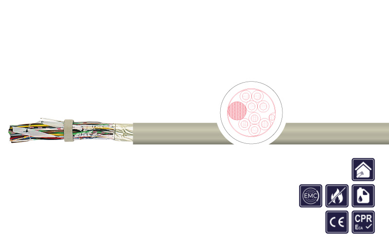 installation cable, data transmission cable, control and connecting cable in telecommunication and IT-systems as well as in measurement and control technology for lossless data and signal transmission. Suitable for use in dry and humid rooms. Outdoor use only with UV-protection, no laying underground.