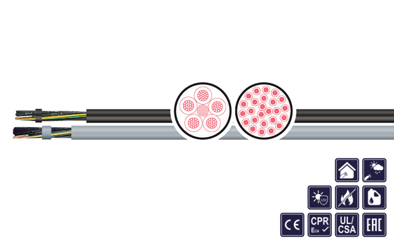 Power, control and connecting cable in electrical facilities for lossless data and signal transmission, fixed laying and flexible applications without tensile stress and without defined cable routing. Suitable for use in dry, humid and wet rooms (also water-oil mixture). Outdoor use (only black type), but no laying underground.